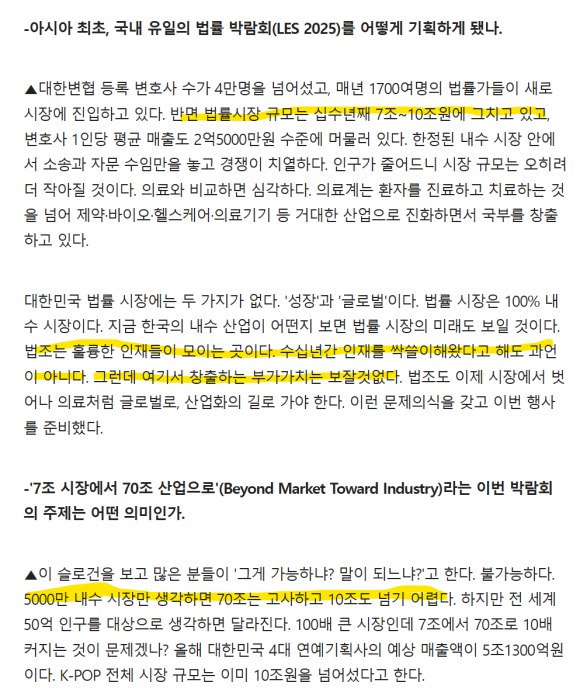 우선, 한국 법률시장이 내수 7조 → 글로벌 70조 산업으로 발전해야 한다는 의견을 부정하는건 아닙니다.