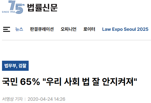 2020년에 대한변협과 법무부가 함께 조사를 했는데, 국민의 65%가 우리 사회에서 법이 잘 지켜지지 않는다고 답했습니다.